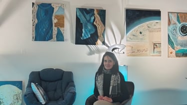 La peinture et l'écriture sont mes deux passions, elles sont surtout un moyen de véhiculer les ondes entre tous. Nous avons tous plusieurs facettes, nous sommes tous témoins de ce que la terre porte, âmes constituées pareillement et sublimement d'ombres et de lumières, d'une palette variée de couleurs et de textures, de vécus et de sentiments, c'est pourquoi vous trouverez dans mes œuvres la cohérence, non d'une touche rassurante esthétique qui colle à un style stéréotypé en lien avec mon image publique d'artiste, mais de la diversité. L'art, même s'il représente un investissement, les œuvres uniques prenant de la valeur avec le temps, même si sa diffusion permet à l'artiste de vivre, en substance, il n'est pas "commercial", il est avant tout un vecteur d'ondes. Humblement, naturellement je parle à travers mes œuvres de la beauté de la création, sa complexité, ses taches, ce qu'elle promet ou refuse, je dessine les contours de la violence à la douceur, de la tristesse à la joie, de la mort à la vie, la renaissance, ou simplement des lignes, des courbes colorées et fusionnées faites pour se fondre dans un décor destiné qui apparaissent comme familières ou appellent à l'imagination une fois exposées. Lorsque je commence une œuvre, il m'arrive souvent de faire tout autre chose que ce que j'avais en tête devant la blancheur du support, emmenée malgré moi sur une histoire qui devait se poser là à ce moment là. C'est une véritable aventure, un nouveau voyage à chaque fois.