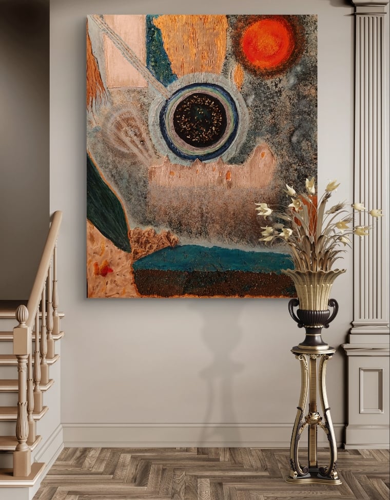 Peinture acrylique, résine et pierres naturelles sur toile tendue